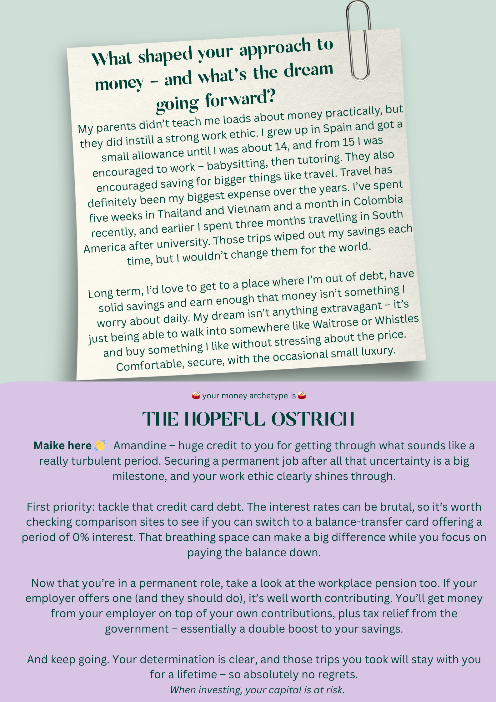 Welcome to Money Archetypes – a series lifting the lid on the often mysterious world of money. Each week, someone from our community shares their real-life numbers, habits and goals – the good, the messy and everything in between – because there’s no one “right” way to do finances. We’ve partnered with Maike Currie, an advocate for improving women’s financial resilience and VP Personal Finance at PensionBee, to help us out. Anything discussed should not be regarded as financial advice and as always with investing, your capital is at risk.
